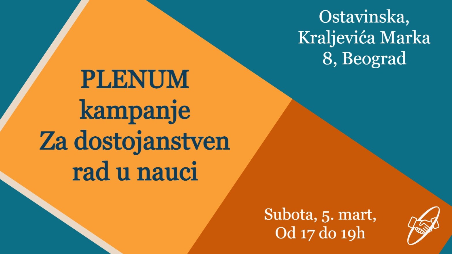 Subota, 5. mart, 17č, Ostavinska, Kraljevića Marka 8 Za više od dva meseca borbe, u okviru kampanje Sindikata nauke Srbije – Za dostojanstven rad u nauci – uspeli smo da prikupimo više od dve hiljade potpisa za Pismo podrške zahtevima sindikata, kao i da na ulicu izvedemo skoro hiljadu radnika u nauci, u borbi zaContinue reading “PLENUM kampanje Za dostojanstven rad u nauci”