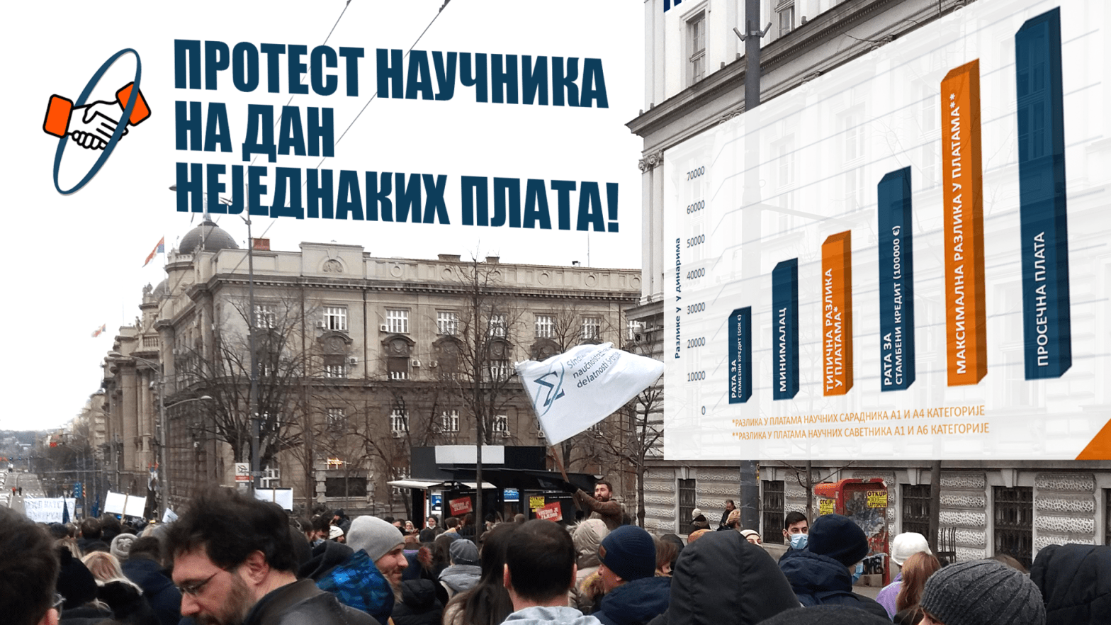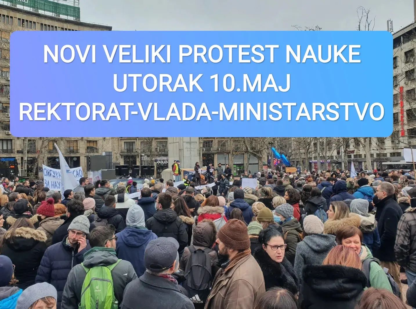 Utorak, 10. maj u 12h, ispred zgrade Rektorata Univerziteta u Beogradu na Studentskom trgu Sindikat nauke Srbije i kampanja Za dostojanstven rad u nauci najavljuju novi veliki protest za 10. maj, do ispunjenja naših zahteva! Okupićemo se ispred zgrade Rektorata Univerziteta u Beogradu na Studentskom trgu, a u protestnu šetnju ćemo krenuti ka Vladi RepublikeContinue reading “VELIKI PROTEST NAUČNIKA DO ISPUNJENJA ZAHTEVA!”