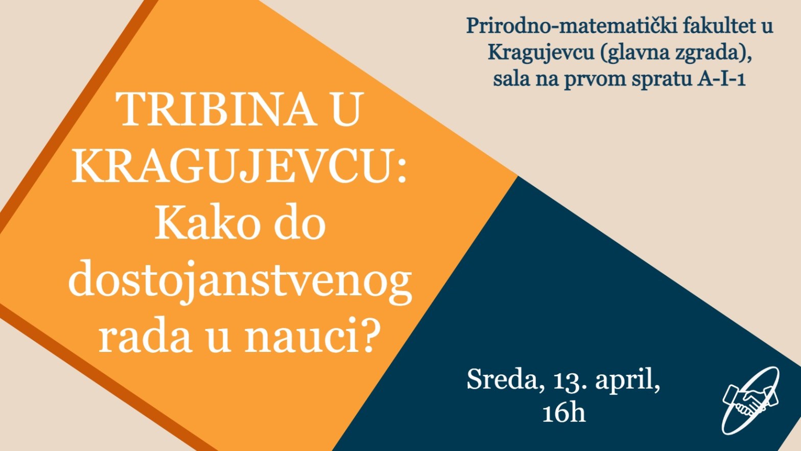 Glavna zgrada Prirodno-matematičkog fakulteta u Kragujevcu (ulica Radoja Domanovića 12), sala na prvom spratu A-I-1, 13 april, 16h Zadovoljstvo nam je što, nakon susreta sa koleginicama i kolegama u Beogradu i Nišu, nastavljamo sa tribinama i ovaj put ćemo biti u Kragujevcu.Podsećamo da već više od deset godina naučni radnici i radnice primaju platu naContinue reading “TRIBINA U KRAGUJEVCU : Kako do dostojanstvenog rada u nauci?”
