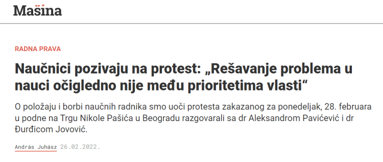 Novinska agencija Tanjug izvestila je sa naše predaje zahteva Vladi Srbije, prilikom čega je za Tanjug izjavu o zahtevima ispred Sindikata nauke Srbije dao Srđan Atanasovski. Vest je, između ostalih, preneo i portal 021.rs